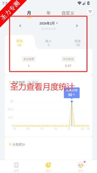 3、统计界面中可查看指定时间段的支出收入统计