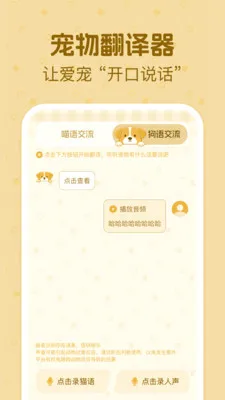 猫狗动物交流神器2026官方最新版本,可实现语音互译,将猫狗叫声转文字、人类语音转宠物声,双向沟通。内置多情绪原声模型,整合宠物百科知识,含行为解析与养护建议,助用户科学养宠。