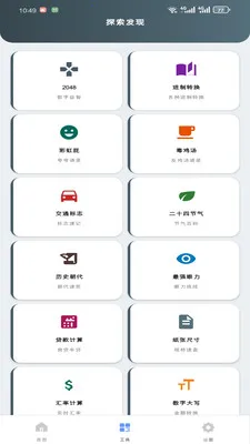 2、工具页实用小工具丰富多样,有进制转换、贷款汇率计算等,满足多种日常查询需求。
