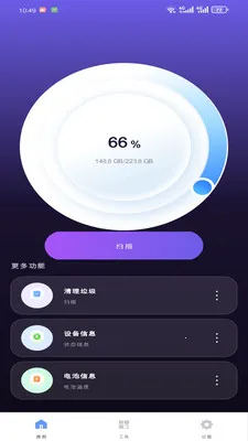 1、清晰呈现设备存储占用情况,能一键扫描清理垃圾,还可查看设备信息与监测电池温度,全方位优化手机。