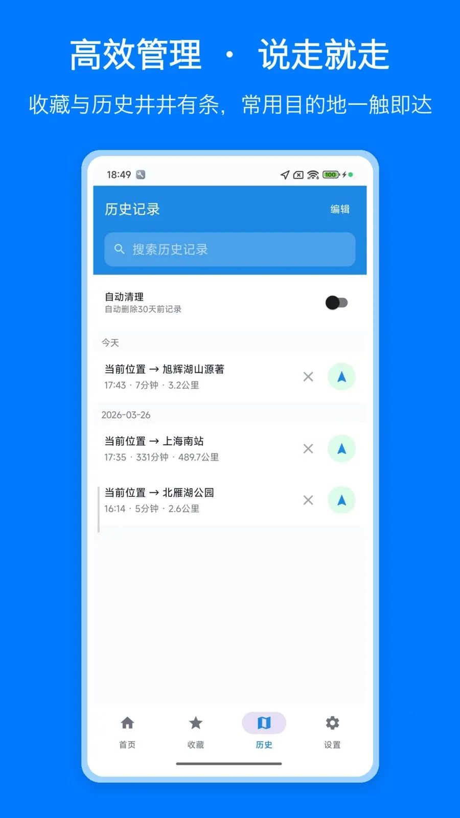 支持收藏常用地点,可按条件筛选历史行程,还带有自动清理选项,方便整理长期使用记录。