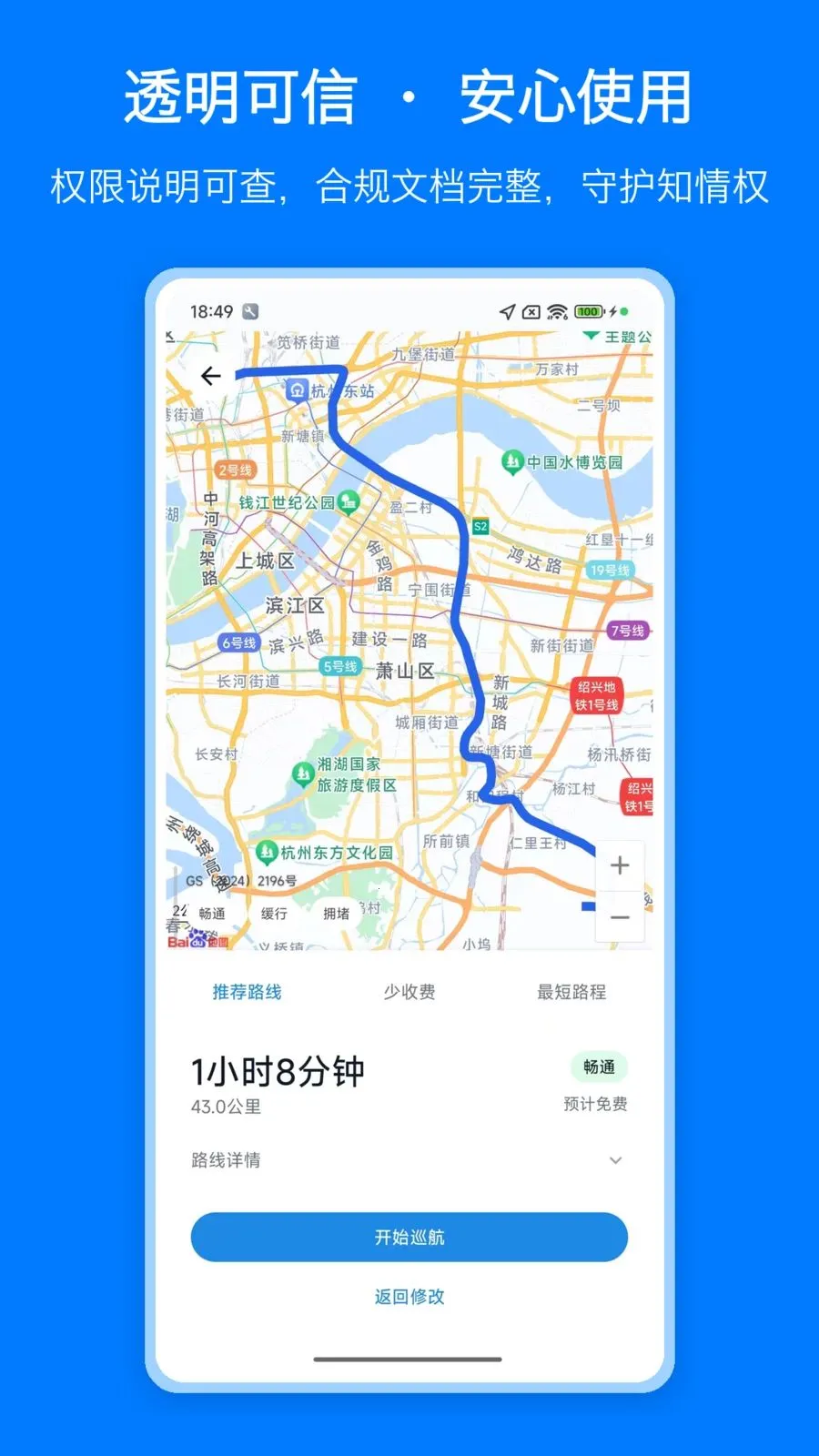 接入百度地图,提供起点终点搜索、多策略驾车路线规划等核心能力,满足日常通勤与自驾出行需求。