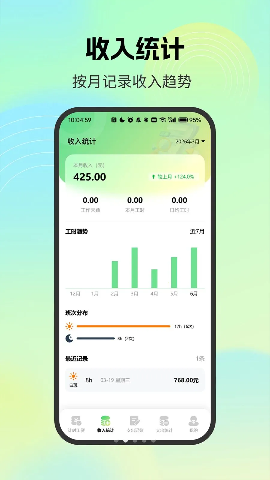 2、精准收入统计:按月展示总收入、工作天数、总工时及日均工时,还有收入趋势图和班次分布图,方便您对比不同月份收入变化。