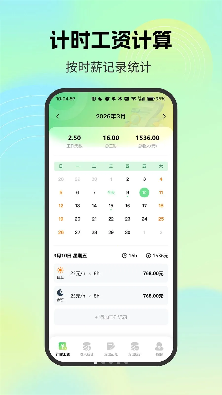 1、清晰掌握财务状况:通过日历视图、趋势图表和分类统计,能让您轻松了解每日工时收入、月度工资条及日常开销,全面掌控个人财务。