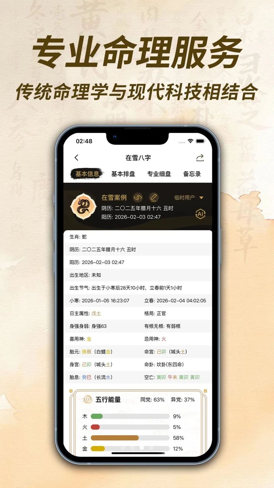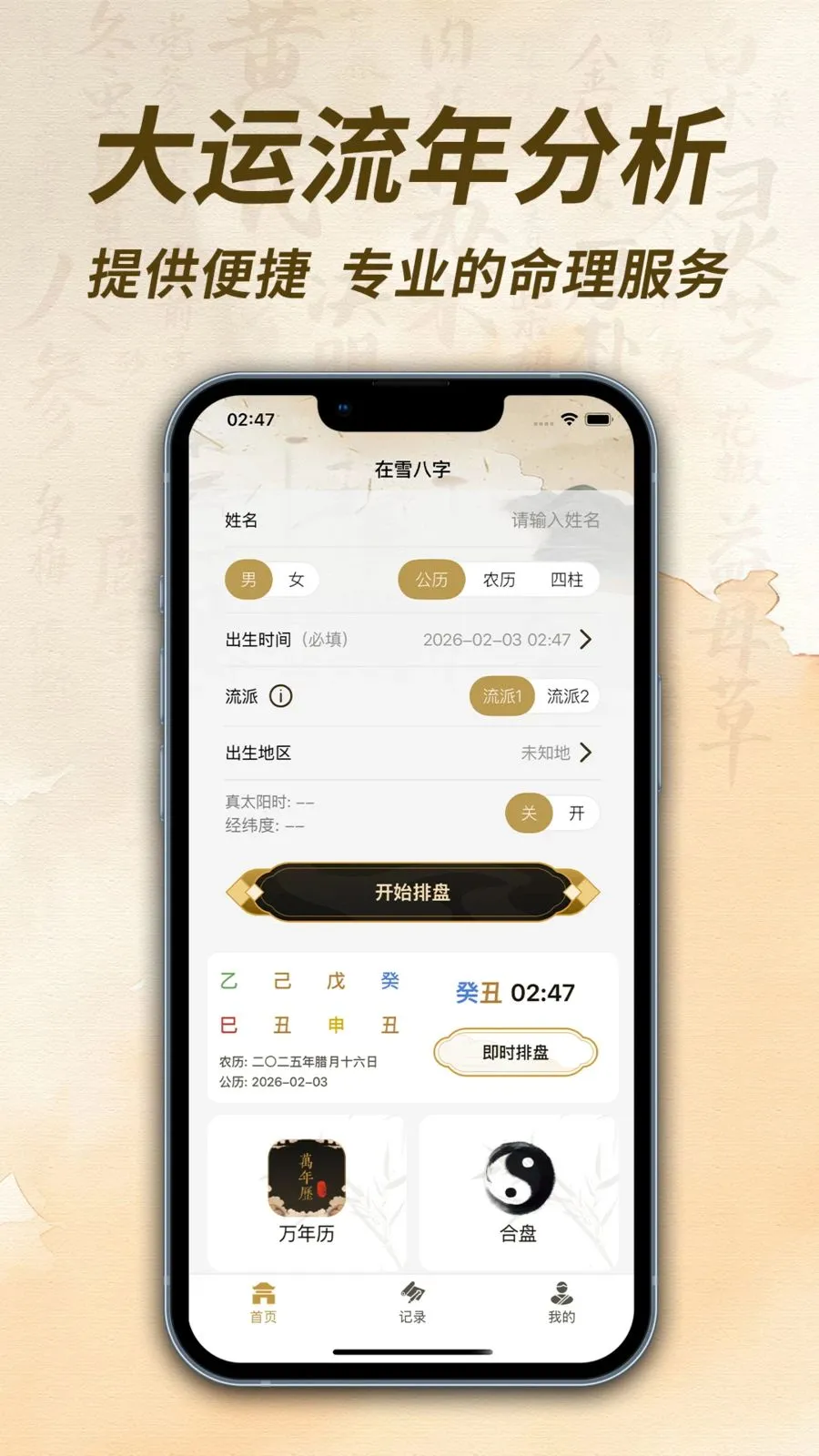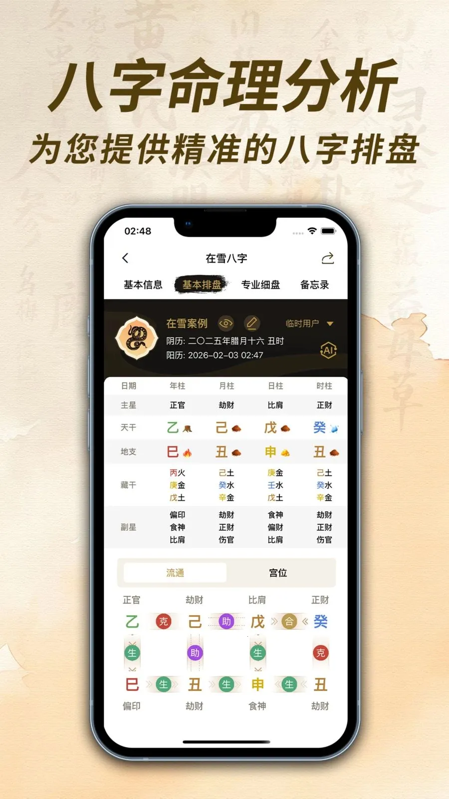 在雪八字排盘是专业八字命理分析工具,有精准排盘、大运流年分析、合盘配对等功能,结合传统命理学与现代科技,提供便捷命理服务。V1.0.1(version20260402)初版,内容仅供娱乐参考。