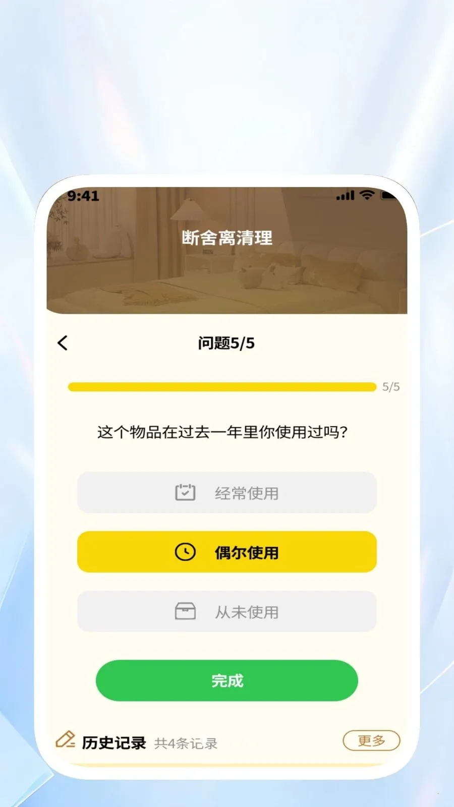 1. 科学引导断舍离:通过递进式提问,辅助用户理性决策物品留存,告别盲目囤积,还有历史记录可回溯,持续优化生活空间。