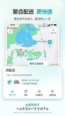 高效便捷,自动同步多平台订单统一管理,一键对接多家配送平台,海量骑手在线,全城配送最快1秒接单,10分钟内上门取货,最远送50公里。