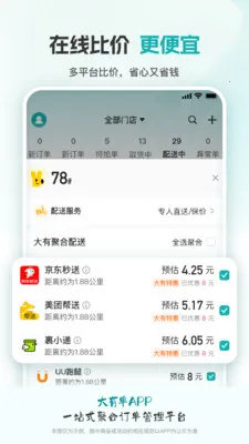 大有单助力千万外卖平台自配送商户,提供订单全链路 SAAS 服务。打通多线上渠道,聚合多家运力供应商,解决订单处理等问题。功能高效便捷、经济实惠、品质保障,覆盖多地,还有新版特性提升体验。