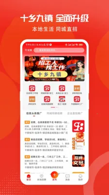 十乡九镇2026官方正版APP是临清市十乡九镇信息技术有限公司的平台,有求职招聘、企业服务等功能,含临时工派单、高工资岗位、企业直聘推广等,还有房屋等本地信息发布,新版优化了部分内容,可在线客服咨询问题。