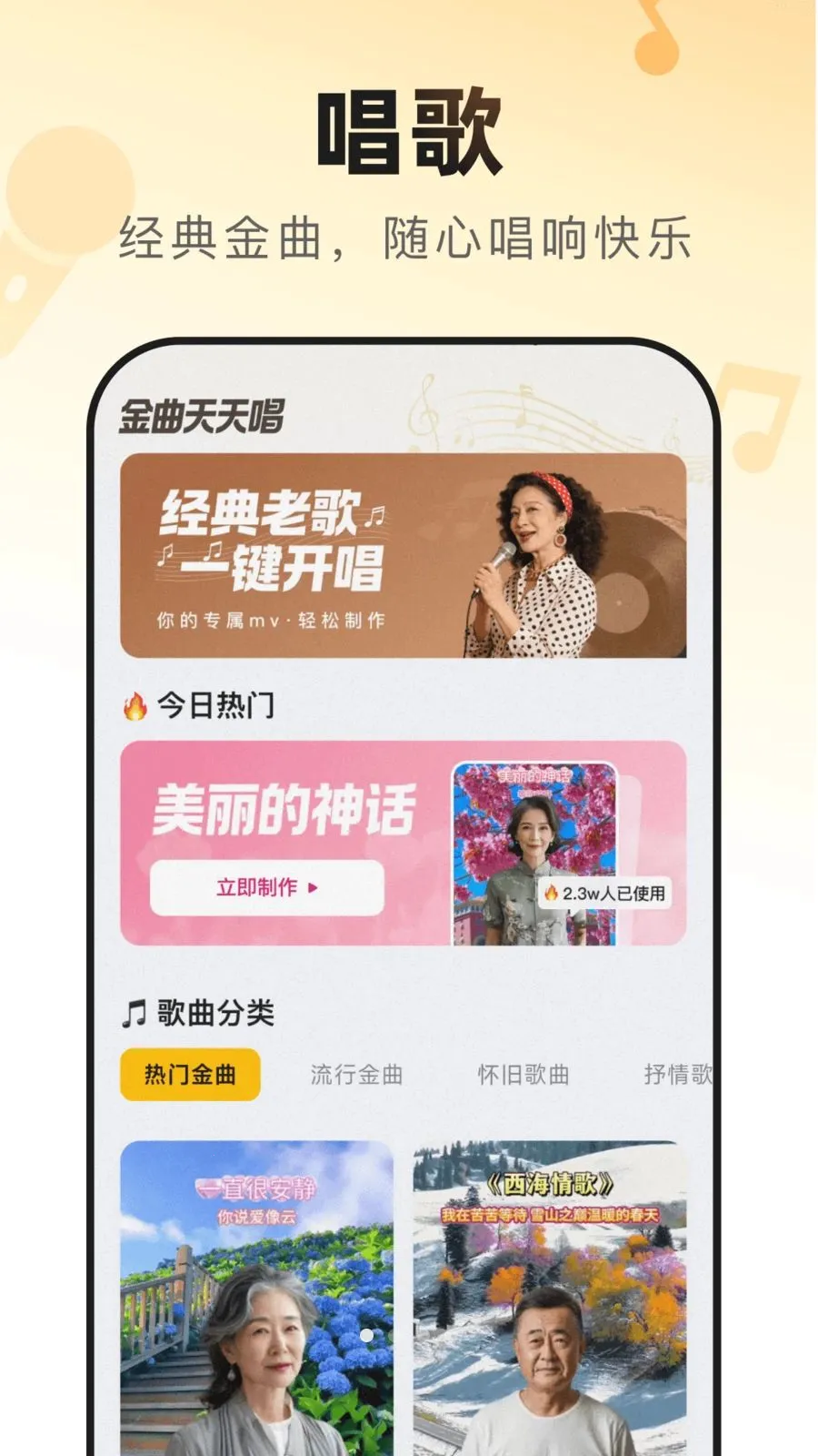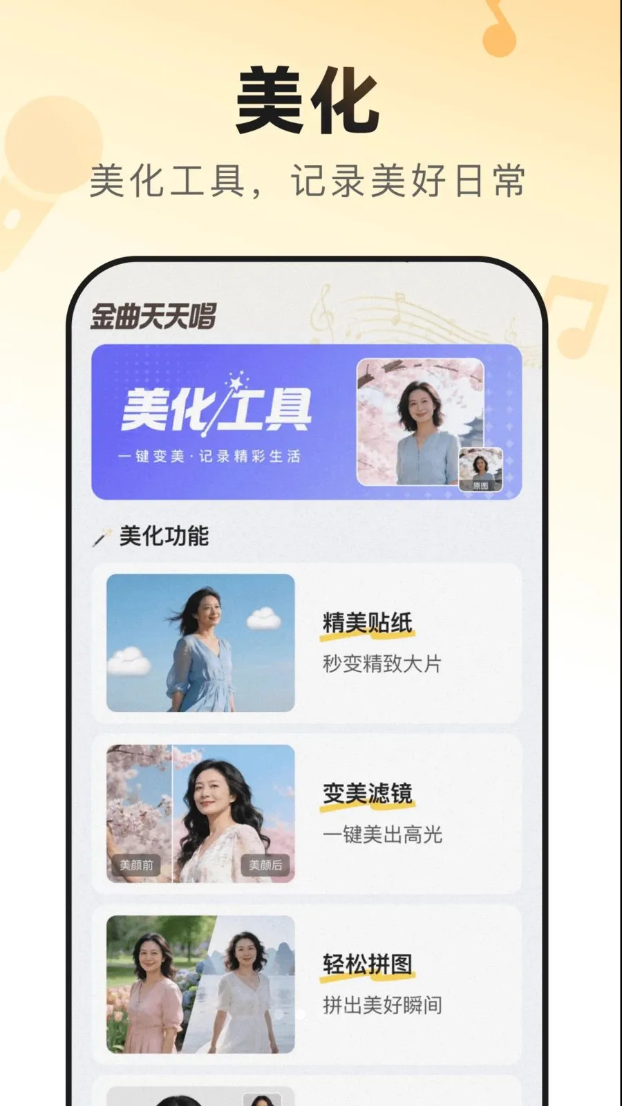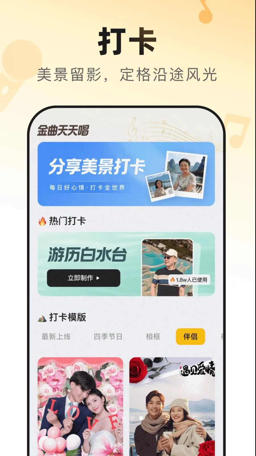 金曲天天唱最新手机版,可随时随地放声唱,还能轻松打卡各地风景留旅途记忆。内置实用相机与精致滤镜,一键优化画面,操作简单,初版本上线,助你优雅呈现歌声与风景,分享美好日常。