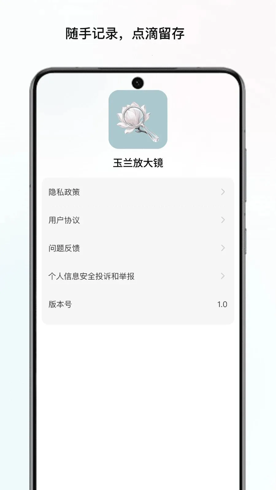 玉兰放大镜2026官方正版,操作简单,提供放大查看、翻译识别、记事计算等实用辅助工具。界面简洁,仅含基础服务。放大与识别效果受环境等影响,结果供日常参考,满足多种基础需求,首次发布。
