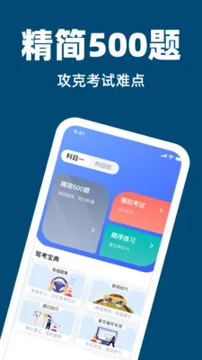 驾考科目刷题最新手机版是驾考备考好帮手。有精简500题助掌握核心,模拟考试还原考场,可按自身选章节练题、看错题解析。还有答题技巧板块,操作简单,为驾考之路助力,新版已更新。