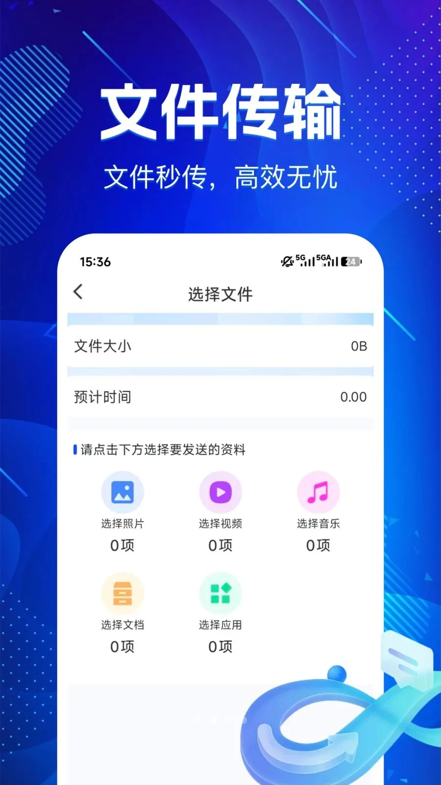 支持旧机发送新机接收双模式,能一键完成图片、视频、文档、应用、音乐等全类型数据的快速互传,告别换机时的繁琐操作与数据丢失风险。