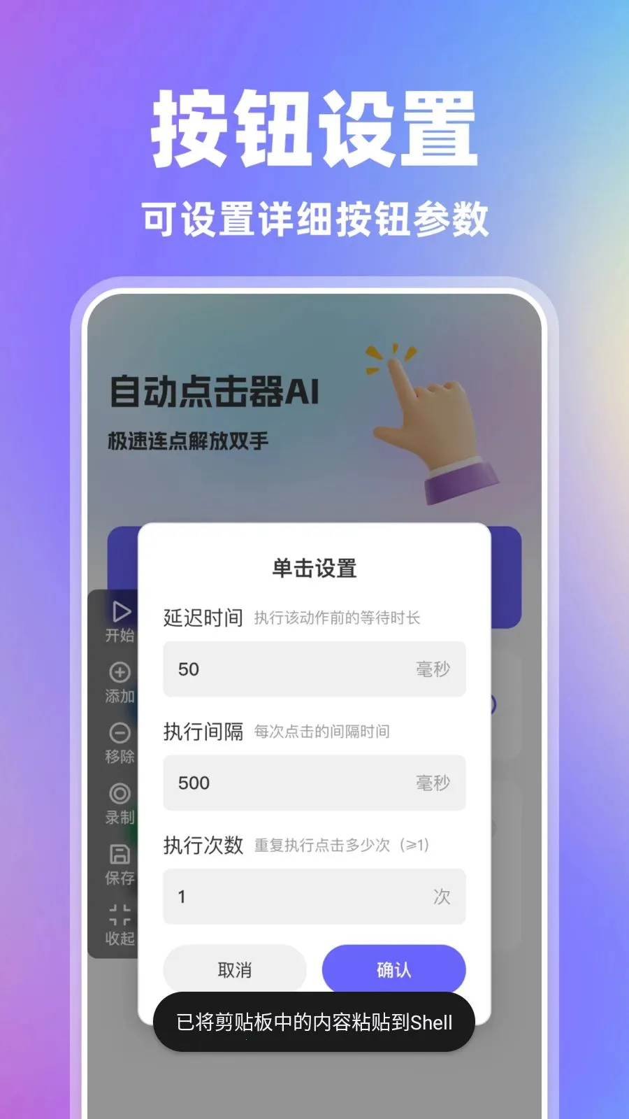 自动点击器AI2026官方正版,能在屏幕完成重复动作,如连点、长按、滑动,速度可调节,一秒可达成百上千次。拖移小圆球指定点击位置,反应毫秒级,指哪打哪,新版上线有新特性。