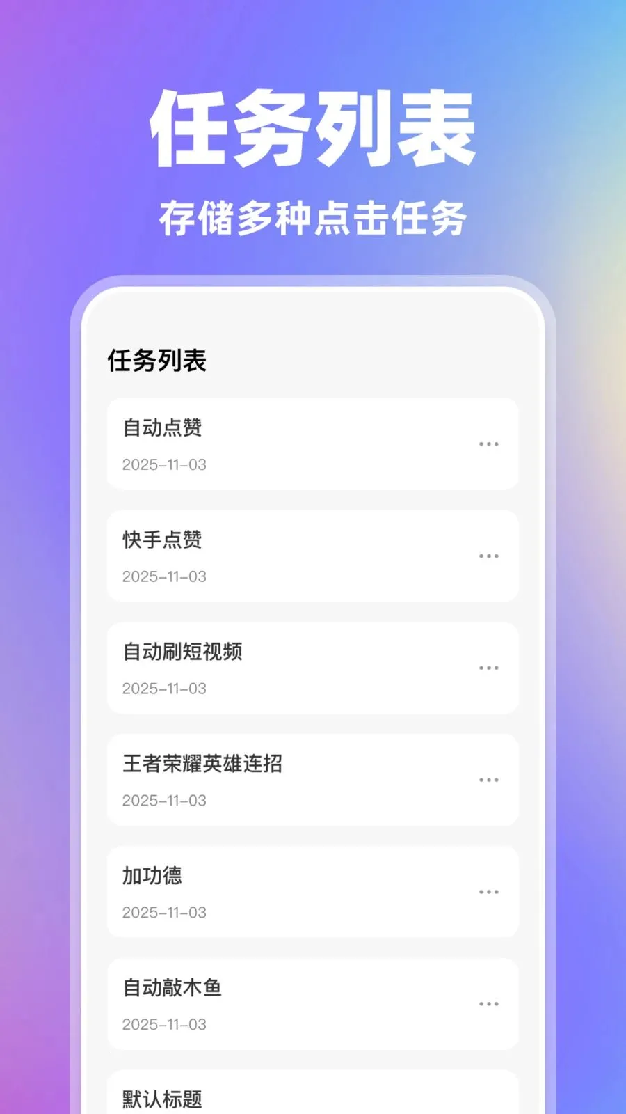 自动点击器能帮你解决重复操作的烦恼!它可以在屏幕上替你完成所有重复动作,无论是连点、长按还是滑动,速度都能随你调节,一秒能点击成百上千次。操作超简单,你只需要拖一下小圆球,告诉它点哪里就行,反应速度超快,达到毫秒级,指哪打哪。有了它,再也不用一次次手动重复那些枯燥的点击动作啦!比如玩游戏时需要频繁点击某个按钮来刷分,或者办公时要重复点击相同位置进行数据录入,它都能轻松搞定。让你从繁琐的重复劳动中解脱出来,大大提高效率。而且新版上线,说不定还有更多好用的新特性呢,快来试试这款自动点击器,享受便捷操作带来的快乐吧!