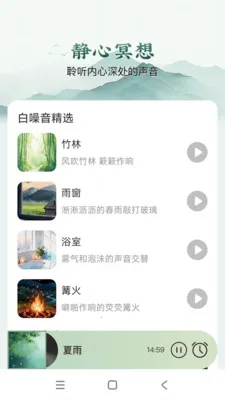 - **静心冥想**:即便身处快节奏生活,利用碎片化时间也能享受放松时刻。软件配备自然白噪音,并搭配温和引导,让你随时随地都能解锁片刻的身心松弛,获得内心的平静。