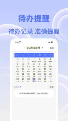 待办提醒:可帮您高效规划日程,支持添加和删除待办。能设置待办事件标题和主要内容,通过日历清晰查看,保证重要事项不遗漏。