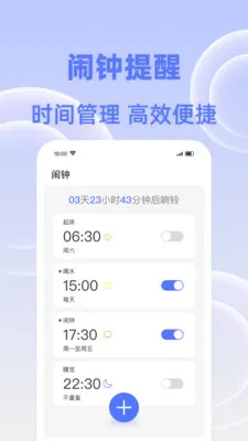 智能闹钟:支持自定义铃声、贪睡模式、振动提醒。能设置单次、每日或工作日闹钟,确保不错过重要事项。还提供天候显示、倒计时等功能,界面简洁操作流畅,助您高效管理时间。