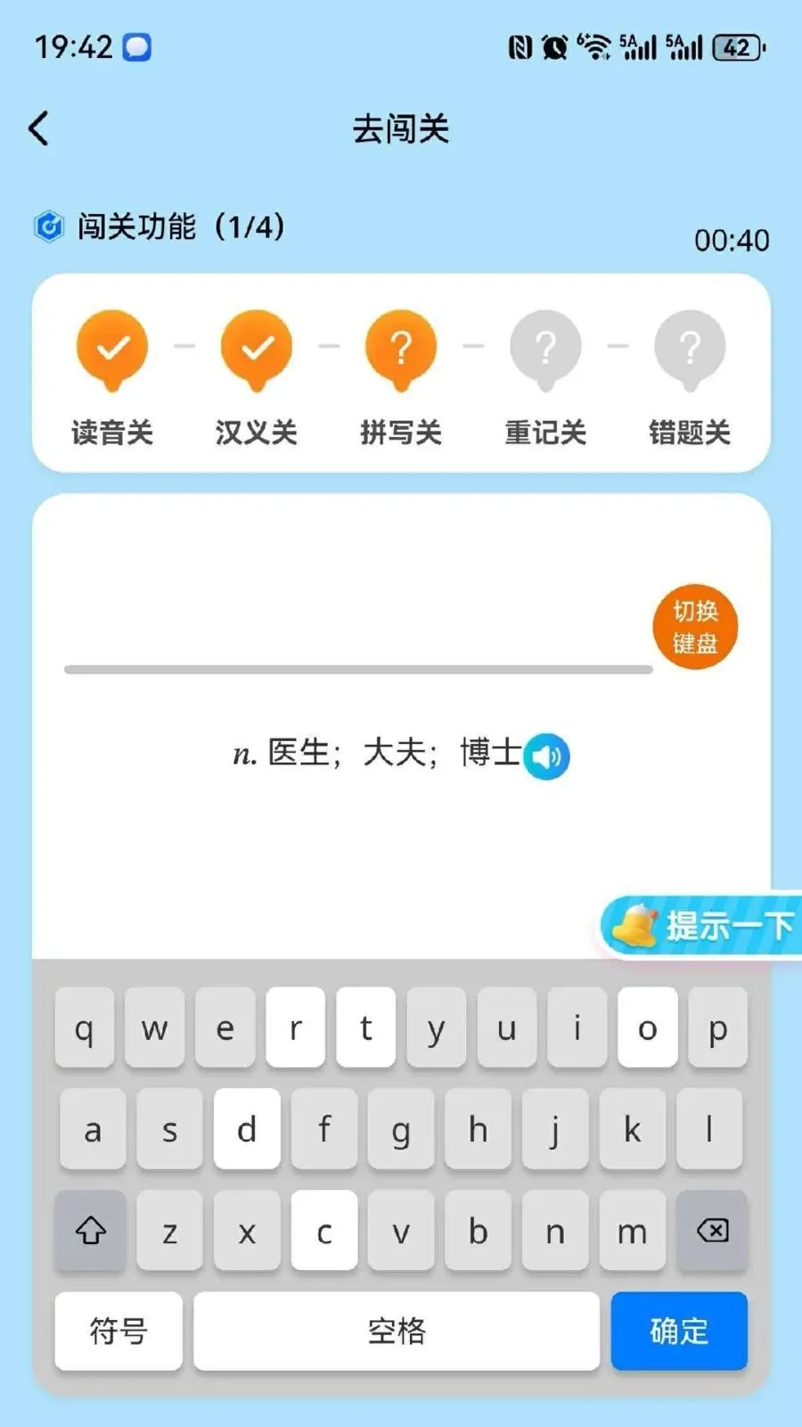 p2:软件设计了闯关系统,设有读音关、汉义关、拼写关、重记关、错题关五关。
