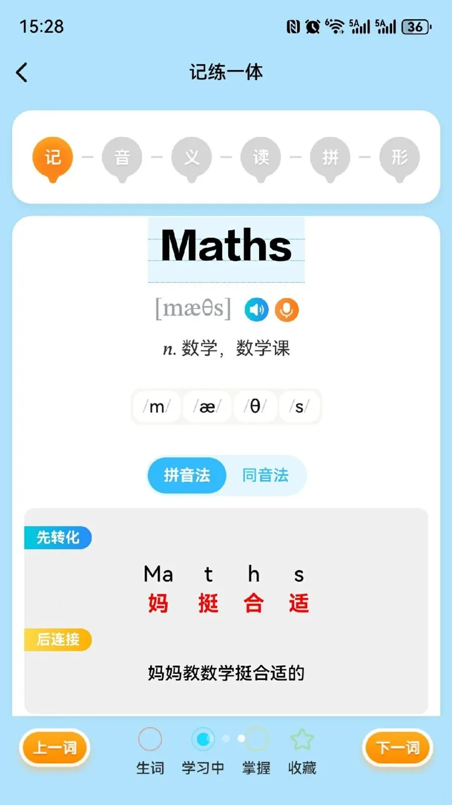 这款从小初高到大学四六级同步的单词记忆软件,特色十足。它集齐了市面上所有五种单词记忆方法,即拼读法、拼音法、词缀法、词源法和同音法,目前并无第六种方法。能让孩子又快又好玩地记牢单词,正常使用至少节约一半记忆时间。版本新特性丰富,不仅用齐五种记忆方法,还设计了闯关系统,设有读音关、汉义关、拼写关、重记关、错题关五关。此外,除课本同步外,还按使用场景对小初大纲单词分类编排,进一步提高记忆效率。**一定要认准官方最新版本**,避免使用到非官方版本而影响学习体验。