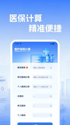 2、缴费计算更精准:内置缴费计算工具,输入基数、比例,一键生成总缴纳及单位、个人金额,精准测算医保费用。