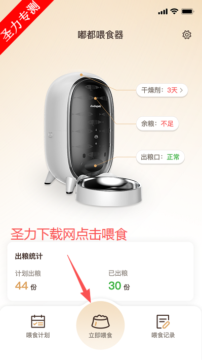 智能喂食器界面可查看出粮统计、进食统计及剩余粮食状态,确保宠物饮食健康。