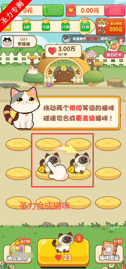 基础合成:玩家点击下方猫咪图案消耗爱心购买低等级小猫,拖动两只相同猫咪到一起即可合成更高等级的猫咪。