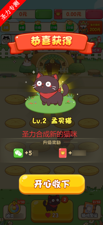 解锁升级:通过不断合成,解锁更高等级全新猫咪,每种新猫咪都有独特外观和属性,随着猫咪等级提升,还能解锁道具助力游戏。