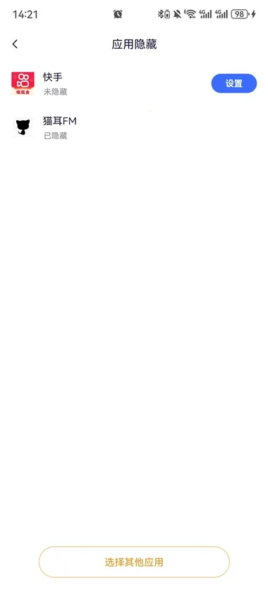 4、再一次点击隐藏应用即可发现已经添加在其中,点击设置;