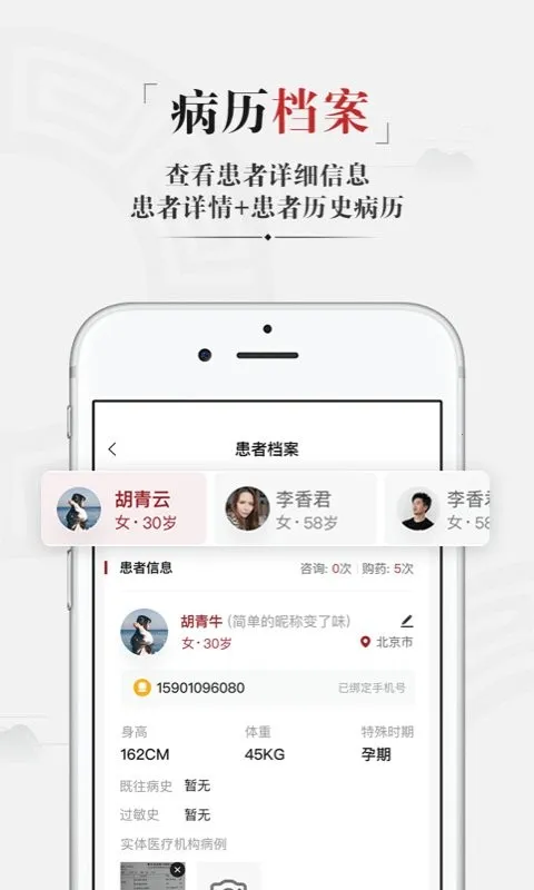 便捷的患者管理:能轻松管理新老患者,历史处方一键重开,线上调药复诊便捷解决,大大增强患者求医时效性,提升中医师口碑。