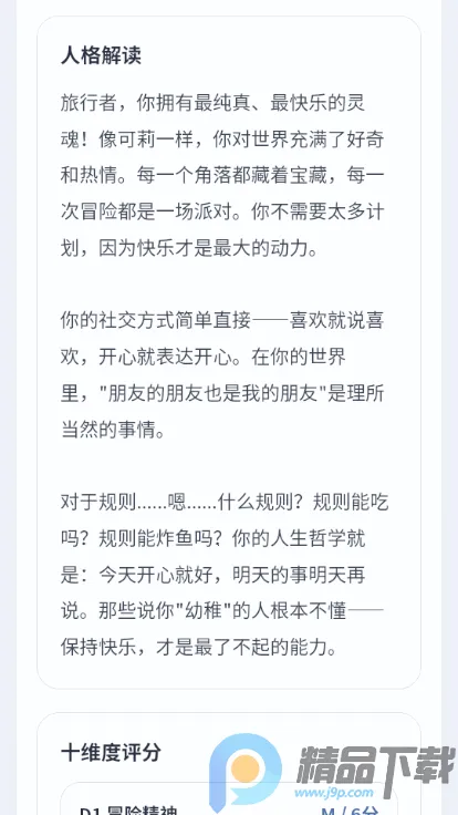 3、深度性格解析:测试后生成详细报告,含性格优劣势、适合职业活动及与角色契合度等。