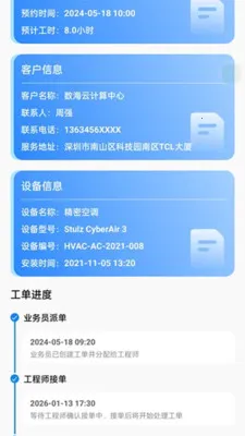 2、无缝对接:业务端一键发起维修订单,实时同步至工程师移动终端,任务流量无缝对接。