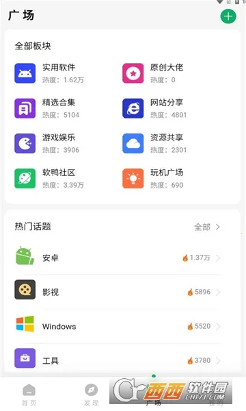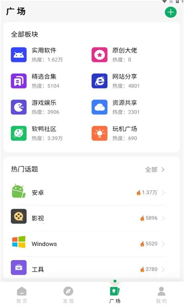 5、在广场页面可以查看到各大版块和热门话题内容,还可以发布自己的帖子